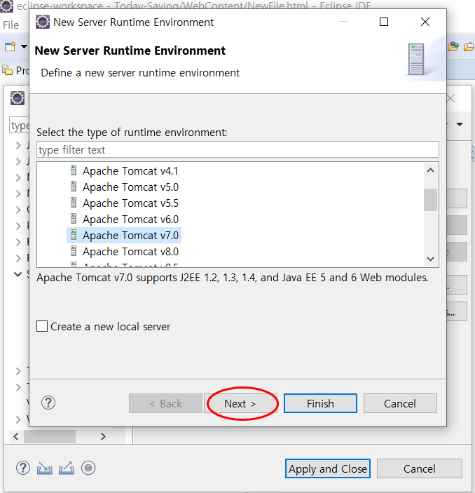 4) Browse버튼 클릭 - Tomcat의 압축을 푼 경로를 지정한 후 - Finish 버튼 - Apply and close 버튼 클릭