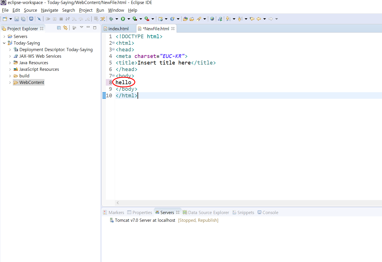 9) html파일을 생성 후 Hello 라고 적어보겠습니다.