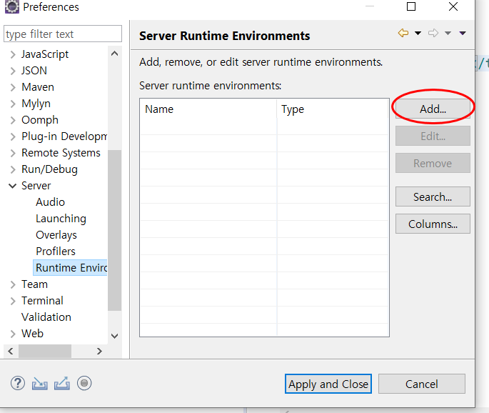 2) 이클립스에서 Window - preferences - server - 에 들어가 Add버튼을 누릅니다.